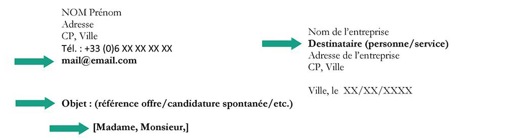 - Objet de la lettre : Soyez précis : mention de l’intitulé du poste, référence éventuelle, ou nature de la candidature (spontanée, alternance, etc.).